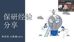 首先进行分享的是2022届毕业生闻泽恺同学,闻同学目前已保研至浙江大学软件工程攻读研究生。他由报名保研夏令营到经历九推,终于成功上岸的经历出发,为大家提供了许多宝贵的指导意见。闻同学强调了信息、选择和心态的重要性:保研时一些关键信息的缺失很可能导致与心仪的项目甚至院校失之交臂,而选择则决定了付出与收获是否成正比,有时候另辟蹊径,能收到意想不到的效果;心态直接影响学习效率,学会维持良好的心态,顶住压力、调节压力,相信一定能成功上岸。闻同学的分享来自切身经历,句句诚恳有力,给出的建议与提醒也中肯实在,引起了同学们的强烈共鸣。