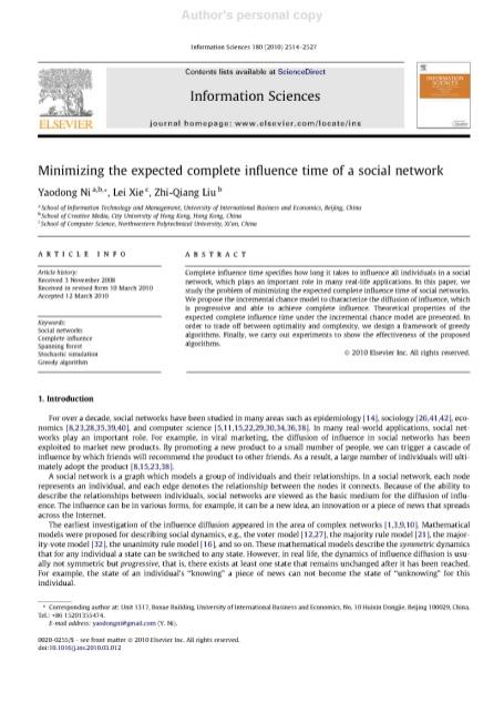 成果信息:Yaodong Ni(倪耀东), Lei Xie, Zhi-Qiang Liu, Minimizing the Expected Complete Influence Time of a Social Network, Information Sciences, 180(13): 2514-2527, July, 2010.