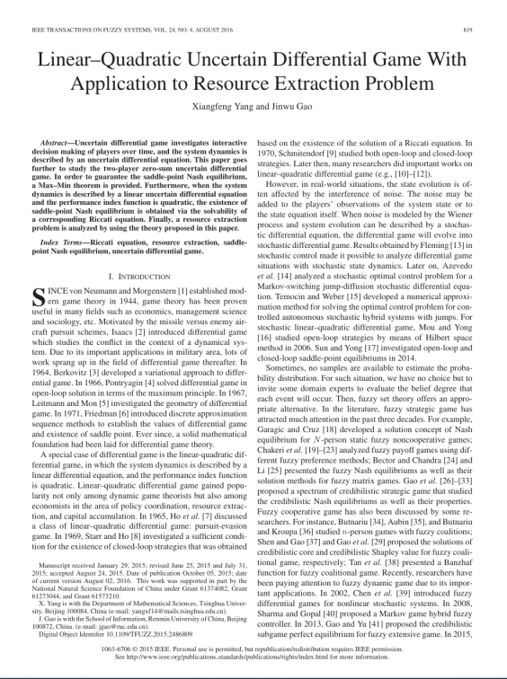 微分博弈的研究现状是:1)确定型微分博弈已经经历60 年,获得了丰硕的成果和重要的应用; 2)随机微分博弈也经历了40 多年,新的模型和应用得到了扩展;3)模糊微分博弈也被提出,但其实质是微分博弈中控制策略的模糊化,状态的演变仍然是经典的微分方程或随机微分方程。作为不确定信息博弈的扩展,不确定微分博弈也必然随着“不确定理论”的发展而发展。“不确定理论”是清华大学刘宝碇教授于2007年提出的一套研究信度的数学分支,目前,不确定理论理论已经被广泛地应用到经济、管理等领域中,许多国内外学者在不确定理论方面都做了卓有成效的研究,其成果得到了学术界同行的认可。