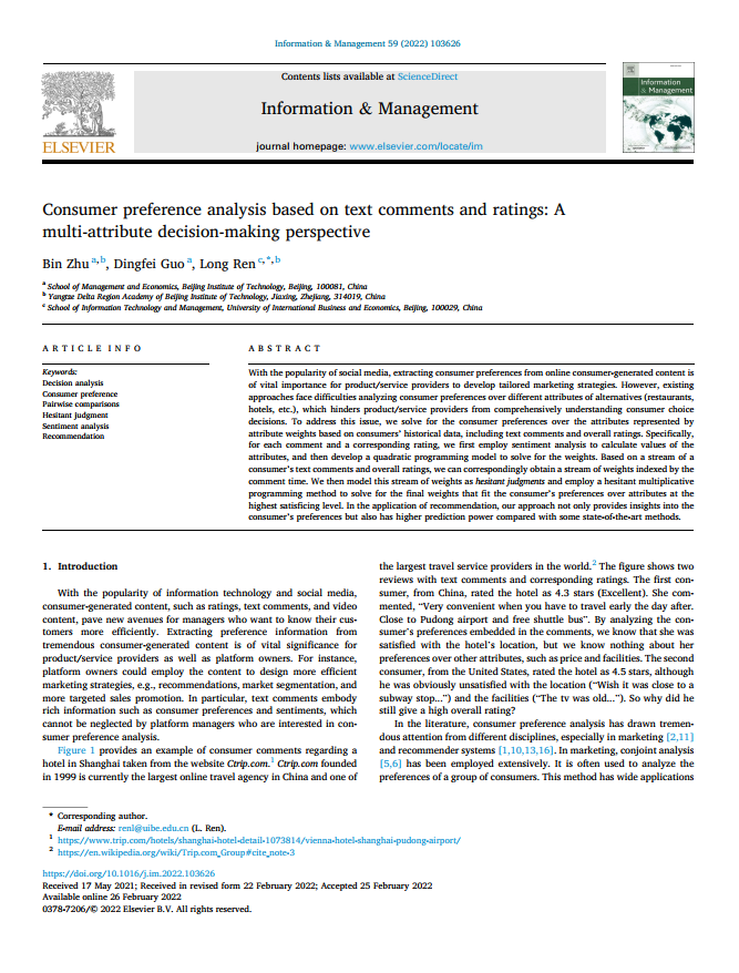 Zhu, B., Guo, D., & Ren, L*. (2022). Consumer preference analysis based on text comments and ratings: A multi-attribute decision-making perspective. Information & Management, 59(3), 103626. (国际A-)